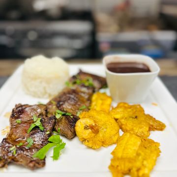 Marinated grilled thin top round steak topped with grilled onions, served with rice, beans and your choice of plantains or House salad.